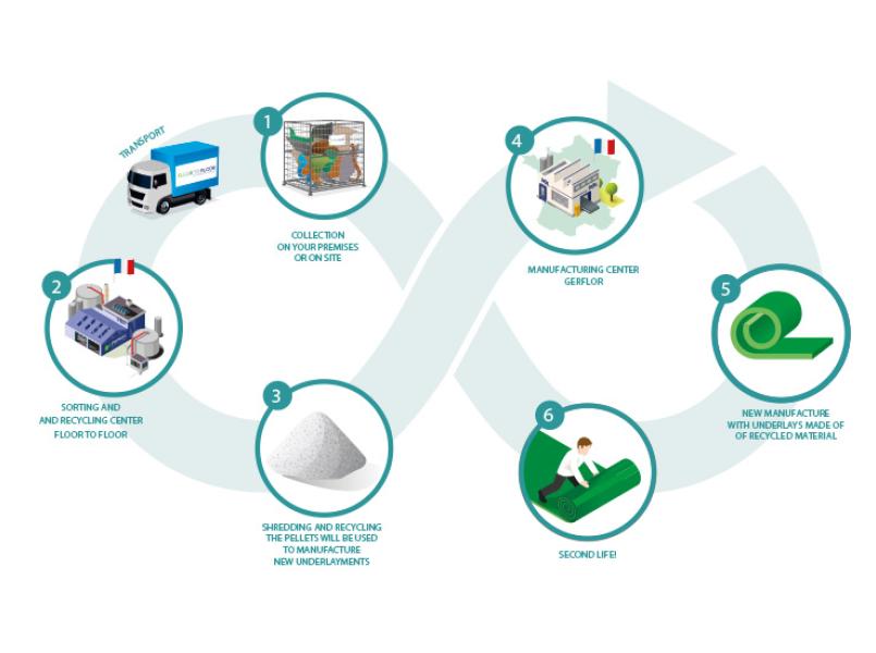 Paprec ile ortak olarak Gerflor, kurumsal müşterilerinden ve distribütörlerinden gelen her türlü kurulum atığını geri dönüştürmek ve üretim sürecine yeniden entegre etmek için geri kazanmayı teklif ediyor. Gerflor ayrıca sökülen yapıştırma zeminlerin geri kazanılması ve yükseltilmesi için de çözümler sunmaktadır.